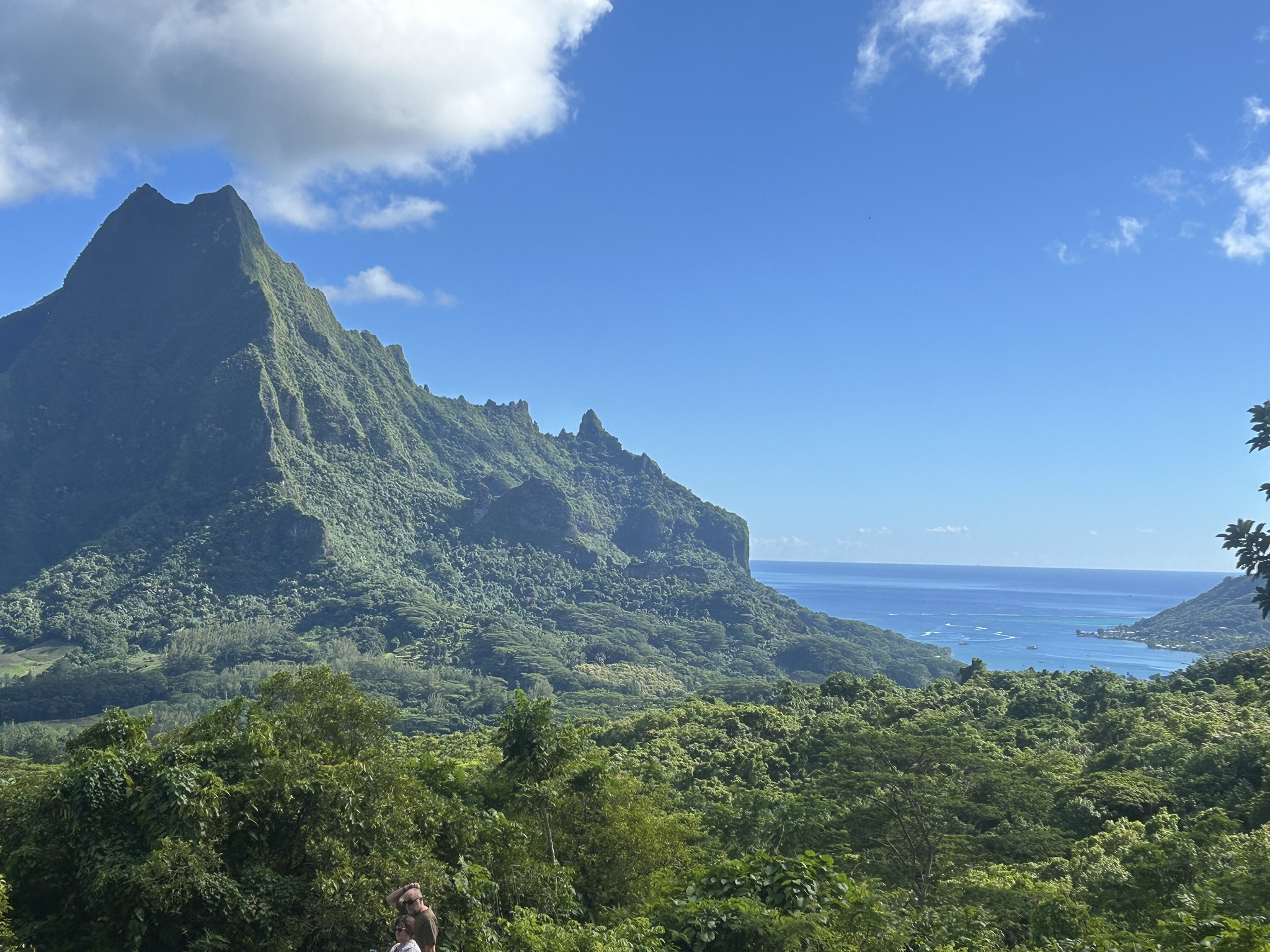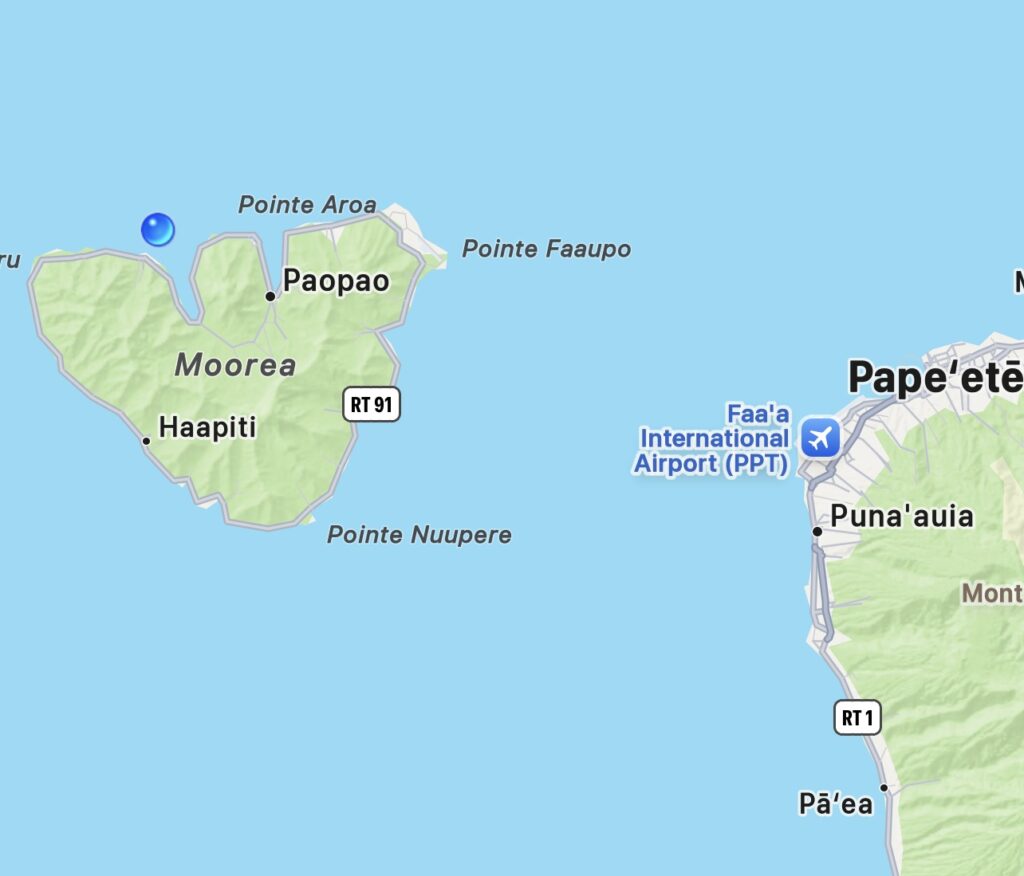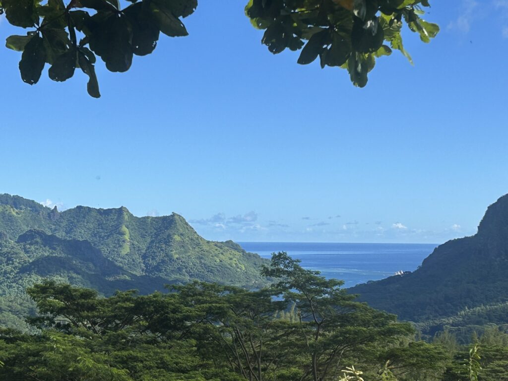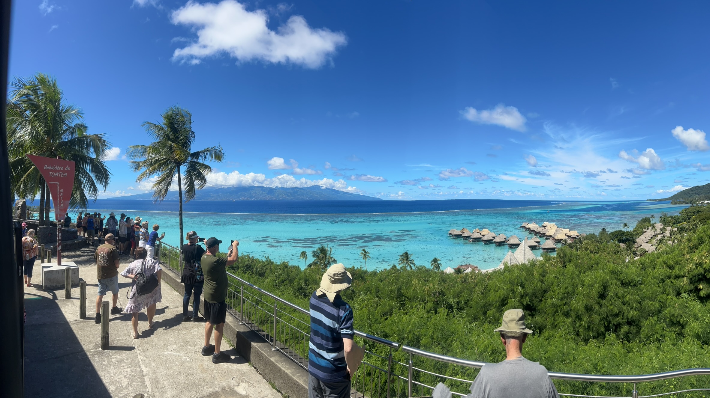 We did stop for 20 minutes at shops and restrooms, but I didn’t get out. Interesting how shopping gets a lot longer stay than sight seeing!!! Another panorama, Tahiti in the background.