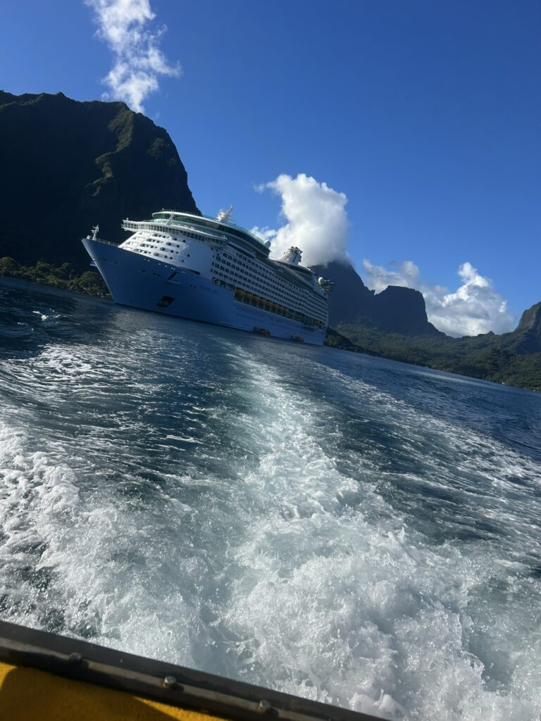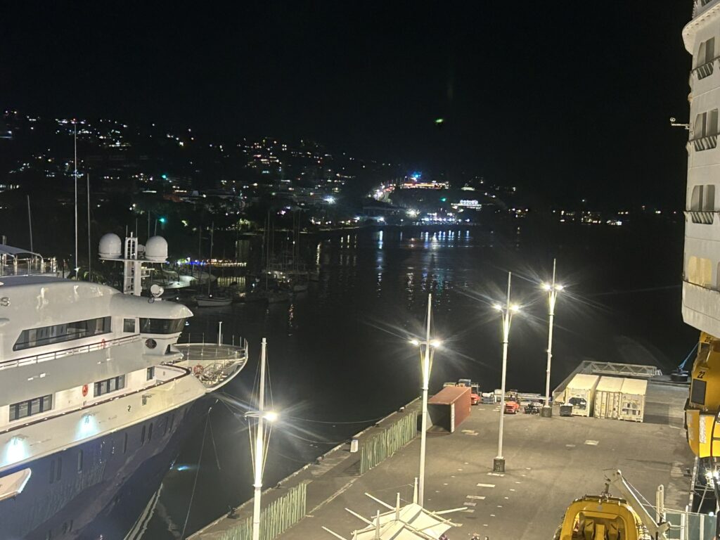 Anyway, we had a much earlier start than yesterday as we were having to use tenders again to get onto land. This time though they decided that the tender we were taking was going to be amidship, so we had to walk through the bowels of the ship (deck 1) where crew quarters and storage areas are to the gangway. I managed a photo over my shoulder out the back door of the tender!