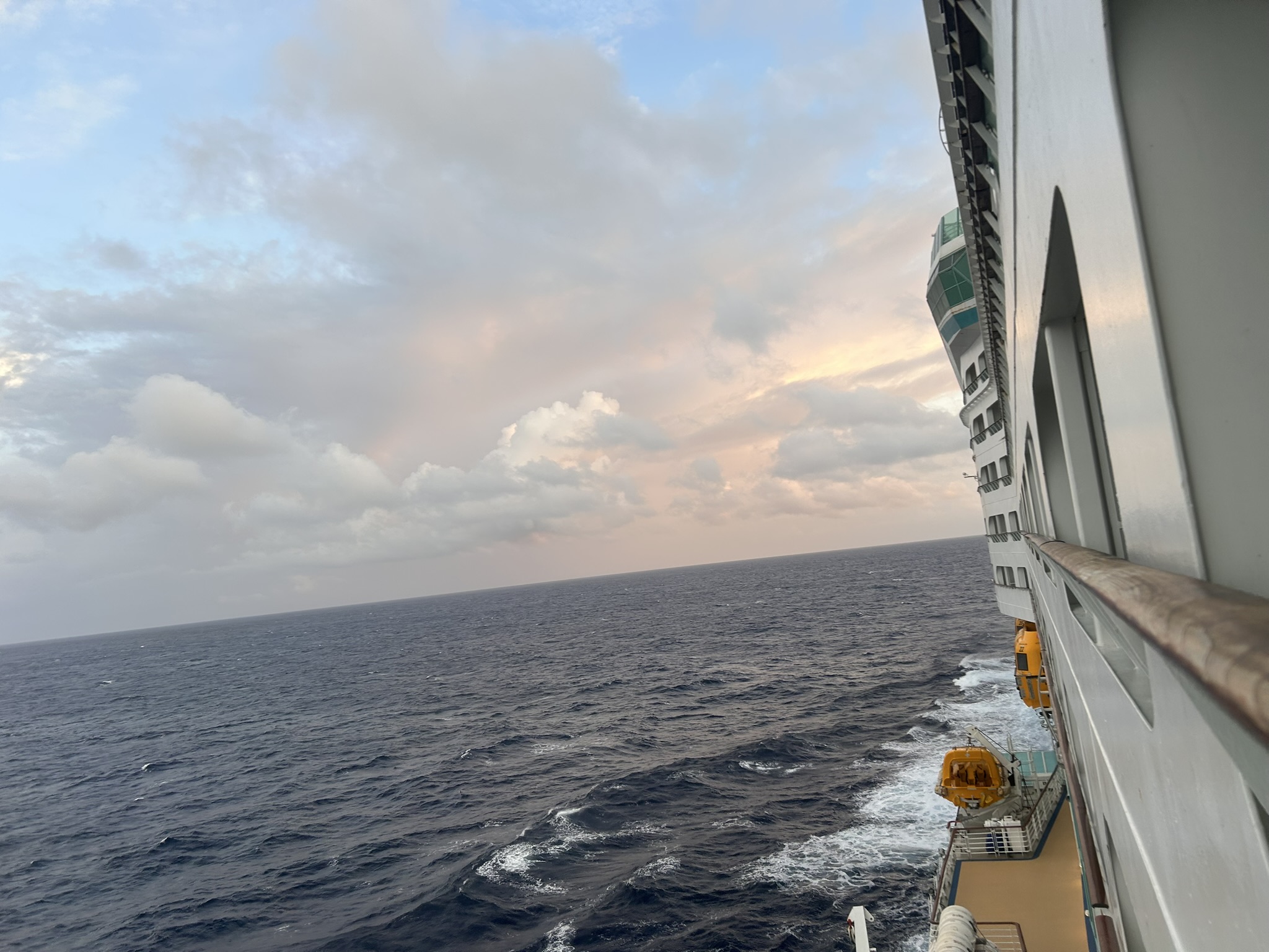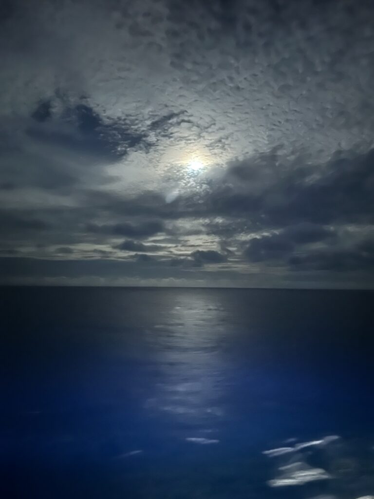 Bumped into Carl entering the dining room as I was leaving it. Jigsaw tomorrow out on the balcony, as long as it isn’t raining still. No sunset tonight at all, we are completely surrounded by grey clouds and rain!