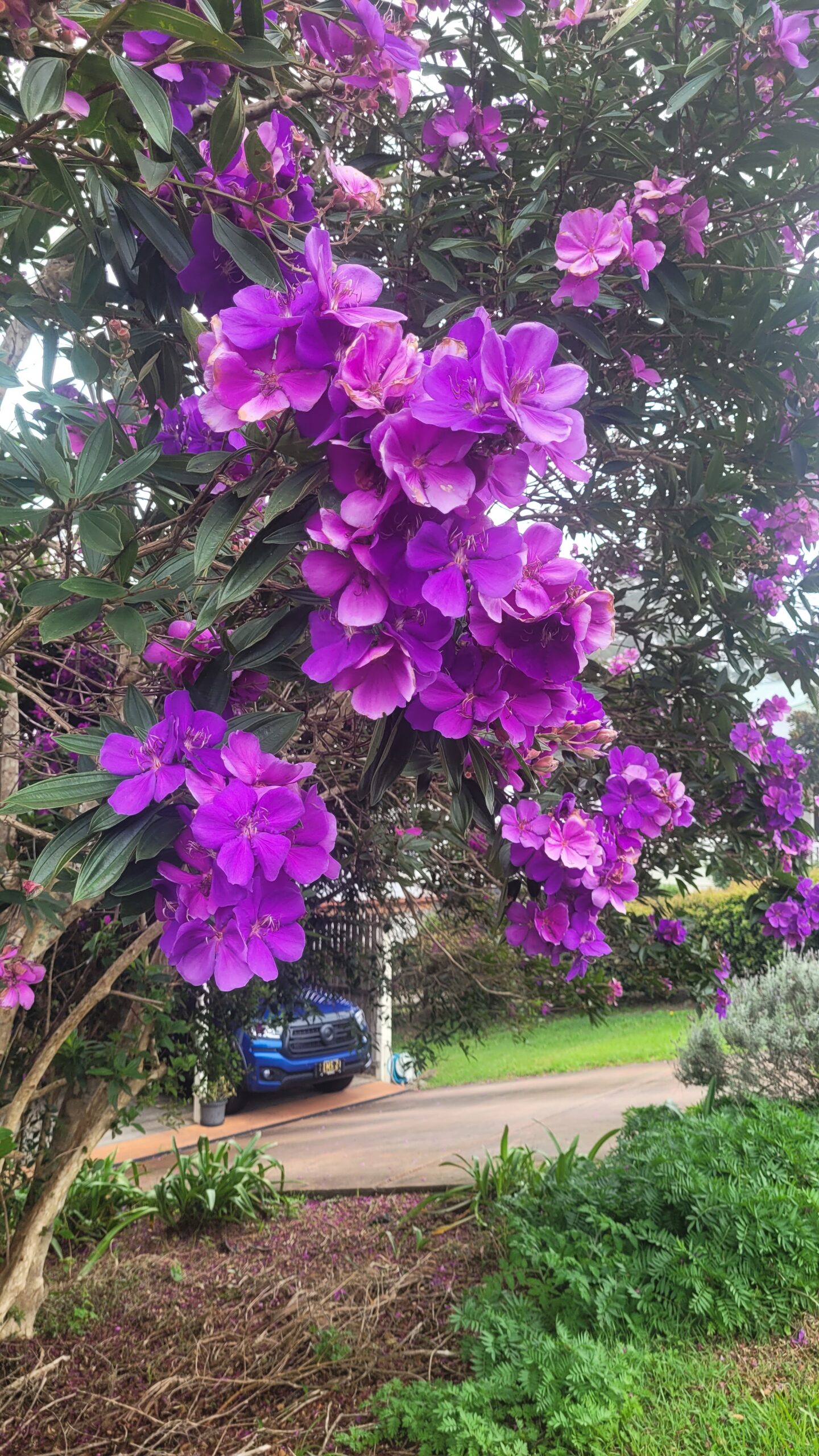 Stopped to take a photo of this Purple glory tree! Made our way home in the rain.