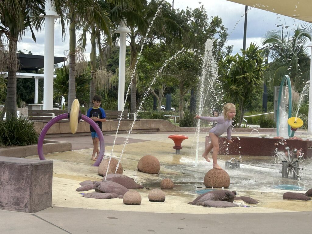 We then headed for a splashpark near the Southern Cross University. Fascinating place with water coming out of all sorts of devices and receptacles. It included a large barrel shaped container that filled up until it was too full and then a huge cascade of water splashed down and completely soaked anyone under it. Archer was completely sopping when he tried it!